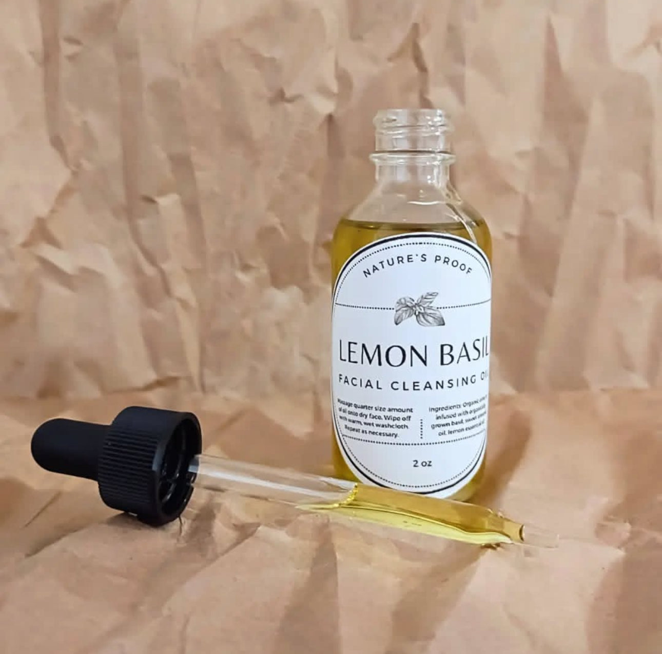 The ingredients in this cleanser are organic olive oil infused with organically grown basil, sweet almond oil, and lemon essential oil.